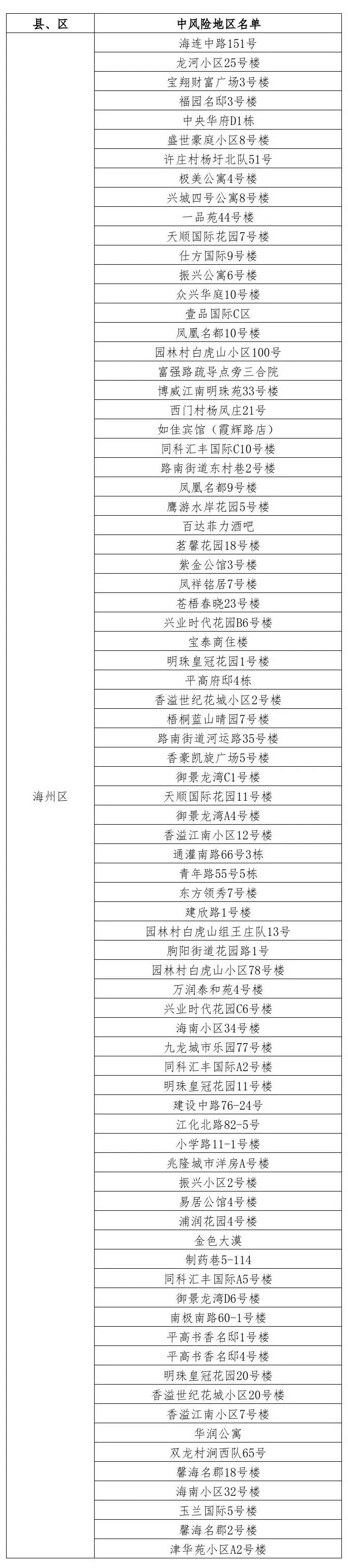 根據(jù)國務(wù)院聯(lián)防聯(lián)控機制有關(guān)規(guī)定,經(jīng)市指揮部研究決定,自發(fā)布之日起,對我市部分區(qū)域疫情風險等級進行調(diào)整:海州區(qū)眾興華庭7號樓、悅城國際9號樓、香溢世紀花城小區(qū)7號樓、許莊村楊圩北隊75號、極美苑2號樓、頤和花園1號樓、麻紡小區(qū)10號樓、銀城公寓1號樓、新建西路30號樓、仕方國際10號樓、吾悅?cè)A府9號樓由中風險地區(qū)調(diào)整為低風險地區(qū)。其他地區(qū)風險等級不變。調(diào)整后全市現(xiàn)有79個中風險地區(qū)。