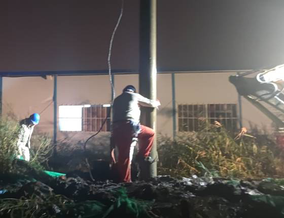 今年的10月天氣還是熱的厲害,電桿被太陽曬的滾燙,搶修人員臉上掛滿了豆大的汗珠,工作服已經(jīng)全部濕透。為了搶時間,抓進度,作業(yè)人員們?nèi)徊活?,依然緊張有序地工作著?,F(xiàn)場搶修工作涉及吊車、挖掘機等大型施工機具,安全管控尤為重要,現(xiàn)場所有搶修人員在工作負責人的指揮下平穩(wěn)有序的推進搶修工作,吊車擺放位置、挖掘機挖桿洞的位置等每一個關(guān)鍵工作點都在搶修人員的嚴格監(jiān)督下進行,不敢有絲毫松懈。就在這時,天公不作美,突然下起了大雨,可是大雨并沒有攔住搶修工作。臺北供電所現(xiàn)場所有的搶修人員在錢所長的帶領(lǐng)下,穿著濕透的工作服在雨中指揮挖掘機開挖桿洞、組立電桿、連接導線-------搶修人員在天昏地暗的雨中穿梭,雨水和汗水交匯在電力搶修人員的臉龐上,大家都來不急擦拭一下臉上的雨水,在雨中忙碌著。經(jīng)過4個半小時的緊張有序搶修,晚上19:30分10KV港北線恢復(fù)供電。