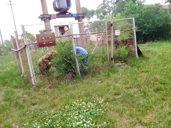 清理外置的變電設備周圍環(huán)境。通過夏季雨水的滋潤,外置的變電設備周圍長滿了鹽蒿、蔓草和蘆葦。有的地方雜草叢生人不能進入給維護造成困難,有的地方蔓草越過圍欄直接爬上電桿威脅線路安全,有的直接被淹沒在蘆葦叢中,不見了蹤影,給變電設備的環(huán)境帶來惡化和安全隱患。為此,供電所組織人員進行全面清理,完成了16處外置的變電設備清理工作。