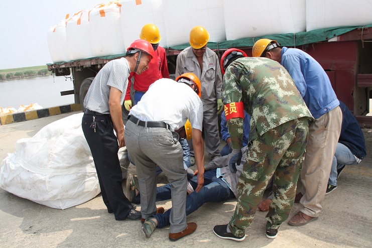 在這次的安全演練中,投資公司運(yùn)營監(jiān)管部部長李長軍主持了這次的安全演練活動(dòng),宵洋物流公司碼頭當(dāng)班作業(yè)人員參與演練。在五灌河碼頭,正在吊裝的噸袋脫落,砸在一名操作人員的腿上,安全員王緒銀立即指揮停止作業(yè),作業(yè)現(xiàn)場安全負(fù)責(zé)人陸應(yīng)兵立即現(xiàn)場指揮人員現(xiàn)場施救,查看傷情,撥打120急救電話,同時(shí)向單位負(fù)責(zé)人沈志兵匯報(bào)。沈志兵及時(shí)趕到現(xiàn)場啟動(dòng)應(yīng)急預(yù)案,疏散場地車輛,讓出120進(jìn)場通道,命令救援小組展開緊急救援,并向公司運(yùn)營監(jiān)管部和領(lǐng)導(dǎo)報(bào)告。在救援中,大家各司其職,齊心協(xié)力,配合默契,有條不紊成功完成了此次演練活動(dòng)。通過這次應(yīng)急演練;進(jìn)一步提高了公司員工在發(fā)生安全傷害事故時(shí)的現(xiàn)場處置能力和自救能力。