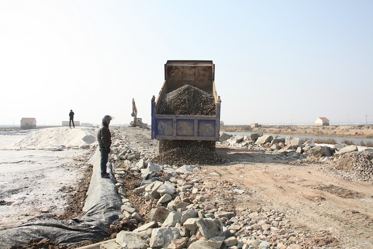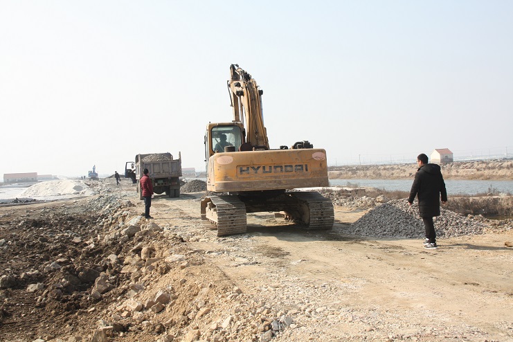2月15日,在新河制鹽公司七至十班運(yùn)鹽路施工現(xiàn)場(chǎng),我們看到南翼公司項(xiàng)目工程分公司的員工正在指揮兩臺(tái)小型工程車(chē)將石子傾倒在路基上,兩臺(tái)挖掘機(jī)正忙于將運(yùn)送來(lái)的石子整平。運(yùn)鹽河對(duì)面,三輛滿(mǎn)載土夾石的大型工程車(chē)一字排開(kāi),正等待卸載。據(jù)了解,目前正在施工的是新河制鹽分公司二期運(yùn)鹽路維修改造工程,該工程改造路段全長(zhǎng)3300米,計(jì)劃總投資193萬(wàn)元,其中路基鋪設(shè)部分由日曬制鹽公司出資45萬(wàn)元,路面部分則由縣交通局承擔(dān),預(yù)計(jì)需要投入148萬(wàn)元。該工程于去年底開(kāi)始施工,預(yù)計(jì)三月中下旬全部鋪設(shè)完成。另外新河制鹽分公司一期一至十二班3300米運(yùn)鹽路改造工程計(jì)劃將于今年下半年實(shí)施。