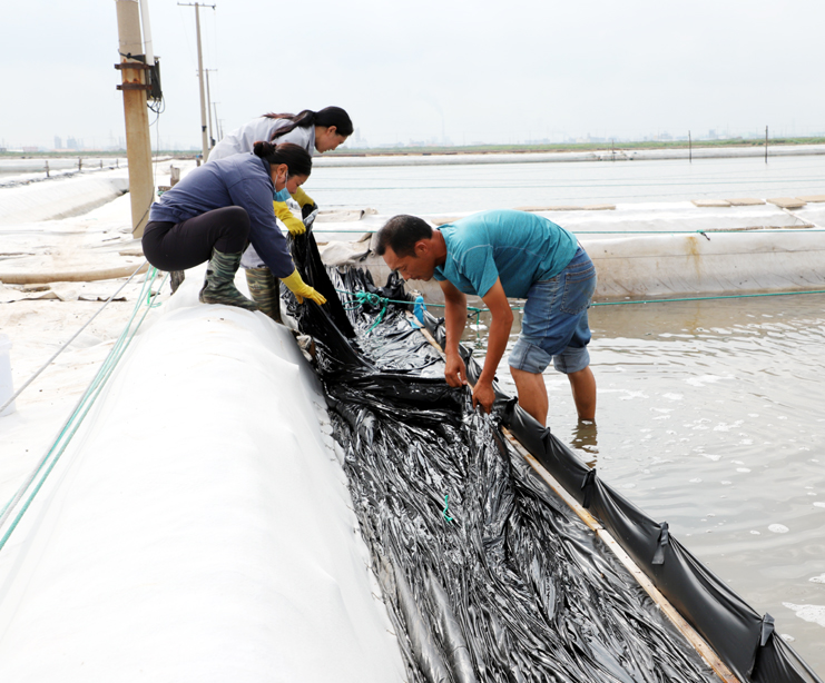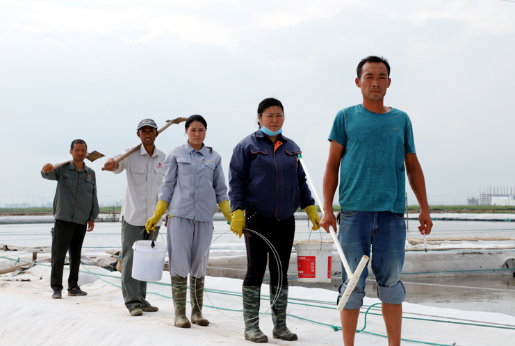 8月15日早,在制鹵區(qū)2班,班長(zhǎng)王春好帶著班組的工人準(zhǔn)備干活,安排好每個(gè)人的工作后,大家拿起工具上灘,工人們分散開來(lái),各自忙著手里的活。工人們前后排開,彎腰俯身,用鐵鍬挖溝做堰,為下雨排淡水做好準(zhǔn)備。“踩在鹵水里能感覺像是在“燙腳”,太陽(yáng)把鹵水曬的滾燙的。”領(lǐng)灘手王春好用衣袖擦著臉上的汗水說(shuō),自己在灘上干了有七、八年了,對(duì)于這樣的工作環(huán)境已經(jīng)適應(yīng)了。進(jìn)入八月以來(lái),連續(xù)7天最高溫度達(dá)到35以上,臺(tái)風(fēng)過(guò)后,今天的氣溫也達(dá)到了33度,令今年這個(gè)夏天,成為有完整氣象記錄最熱的夏天。跑水工仇海濱,到灘上一個(gè)多小時(shí),以是大汗淋漓,他帶領(lǐng)工人做一些修堰、補(bǔ)塑布、緊繩、還有查跑道頭的活。