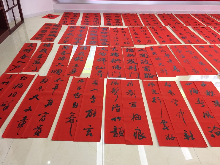 此次活動共邀請了3位書法愛好者為職工免費(fèi)寫春聯(lián)、贈春聯(lián),紅色的春聯(lián)和熱鬧的人群將活動現(xiàn)場映襯得年味十足。書法愛好者們飽含熱情,擺開書案,攤開宣紙,揮毫潑墨,將真誠的祝福賦諸筆端。宵洋物流的職工們紛紛趕來現(xiàn)場排隊(duì)幫忙,互相談?wù)撝鞲贝郝?lián)的寓意,有的根據(jù)新年心愿從準(zhǔn)備好的春聯(lián)中精心挑選特邀書寫,有的期望書法愛好者為其精心定制現(xiàn)場創(chuàng)作。濃濃的情意、真摯的祝福溢于字里行間,大家拿著一幅幅寓意喜慶,飽含祝福的春聯(lián),喜笑顏開,不停表達(dá)著對灌云縣海事局和縣書法協(xié)會的感謝。(宵洋物流 邱利民)