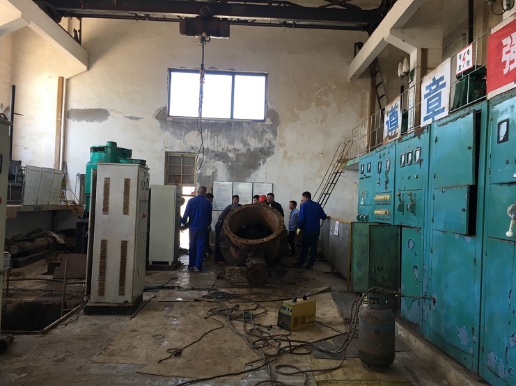 近日高溫高蒸發(fā),全場(chǎng)海水養(yǎng)殖區(qū)海水需求量變大,養(yǎng)殖池塘水位連續(xù)告急,另六圩閘閘站五號(hào)機(jī)泵的水葉老化,出水量變小,導(dǎo)致工作效率降低,不能滿(mǎn)足日常的工作要求。于是副經(jīng)理孫曉波帶領(lǐng)資源管理公司人員配合生產(chǎn)部機(jī)修人員對(duì)六圩閘機(jī)泵進(jìn)行搶修,為了趕在潮水之前爭(zhēng)取把水葉搶修好,大家擼起袖子加油干,有人開(kāi)行車(chē)、有人拿撬棒、有人拿大錘、有人拿特制大扳手、有人拿電焊槍等,大家齊心協(xié)力各有分工,終于完成吊泵和水葉拆卸、安裝等,現(xiàn)場(chǎng)出現(xiàn)一片繁忙的景象。為能夠早日修好機(jī)泵,保證正常供水,十余人起早貪黑在六圩閘站的大機(jī)房努力搶修著。