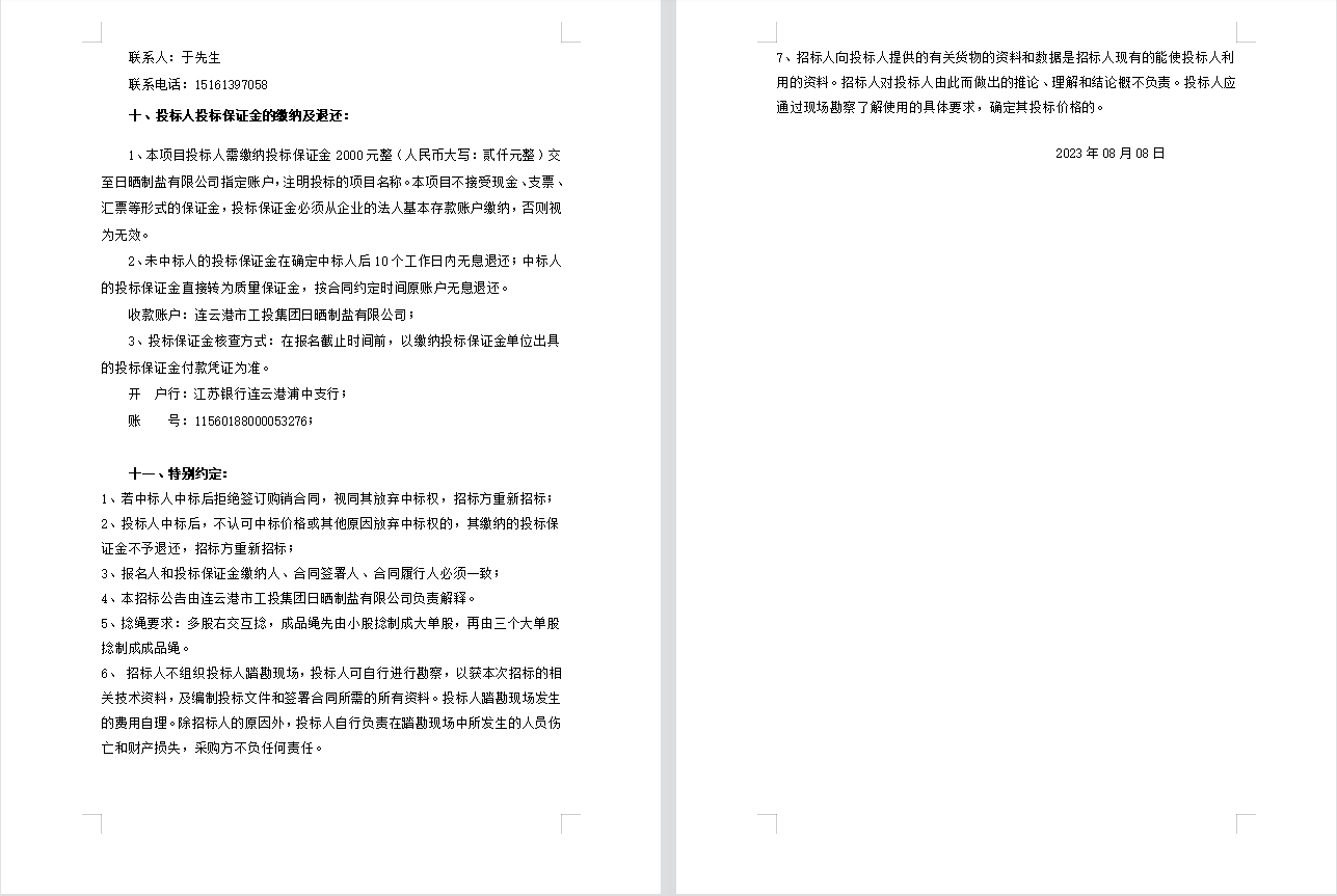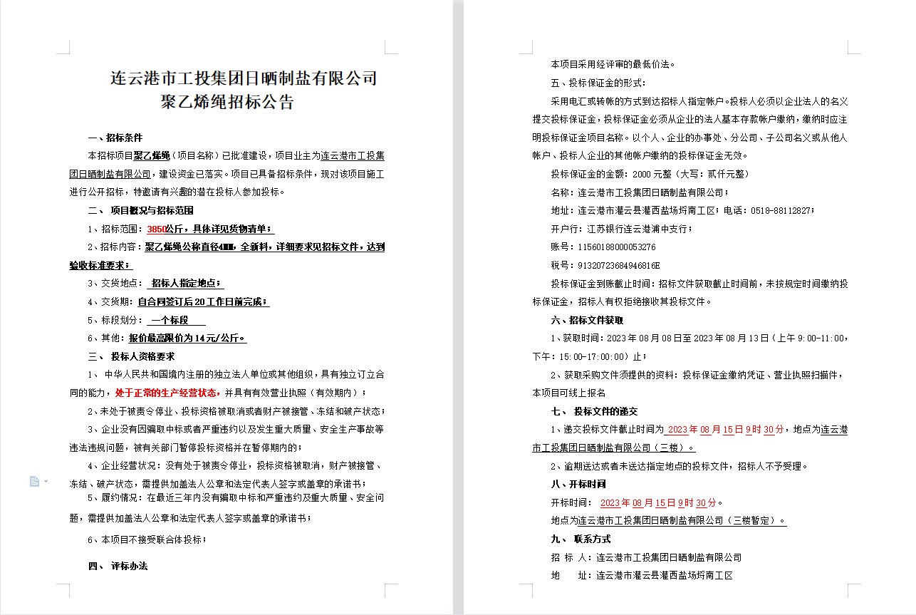連云港市工投集團(tuán)日曬制鹽有限公司聚乙烯繩招標(biāo)公告