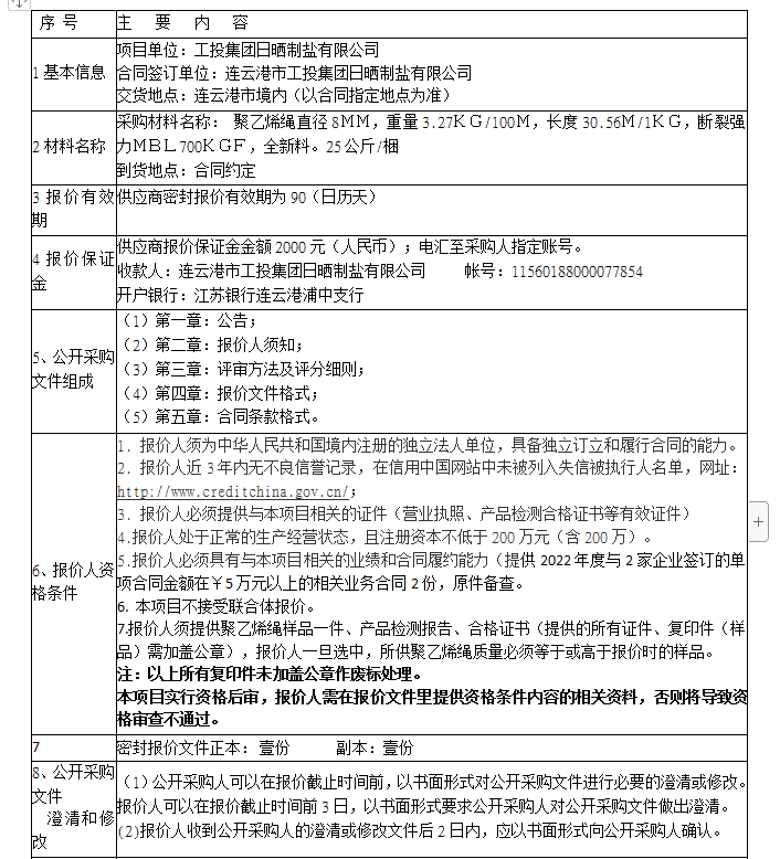 報價保證金接收人:連云港市工投集團日曬制鹽有限公司。