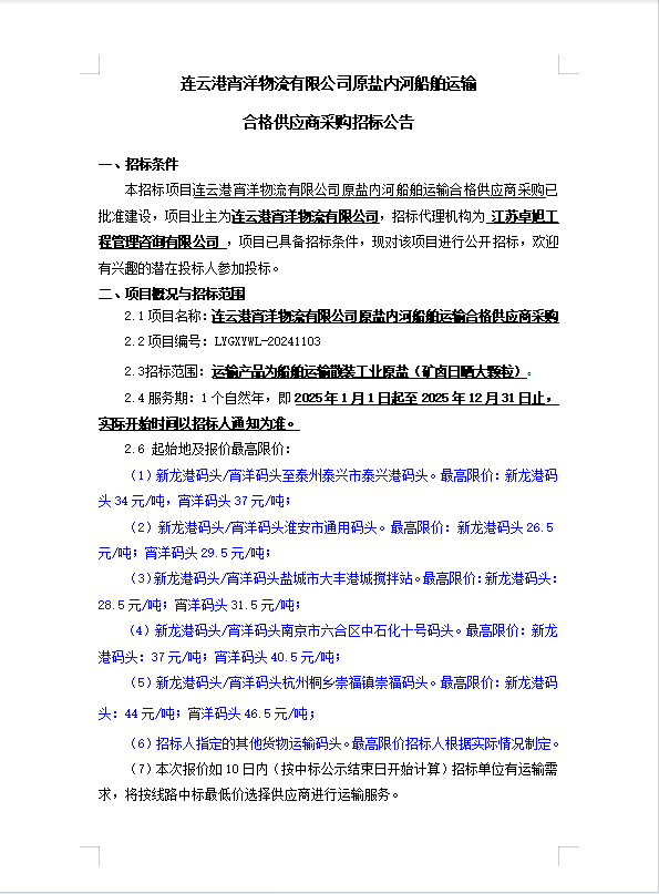 連云港宵洋物流有限公司原鹽內(nèi)河船舶運(yùn)輸合格供應(yīng)商采購(gòu)招標(biāo)公告