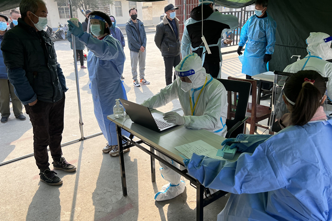 圖為黨員霍晶協(xié)助醫(yī)務(wù)人員對居民進行核酸采樣