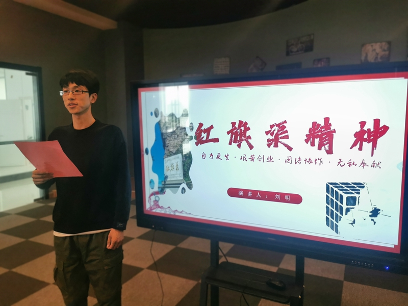 一場演講比賽——“自力更生、艱苦創(chuàng)業(yè)、團結(jié)協(xié)作、無私奉獻”,青年職工走上講臺,述說著勤勞勇敢的30萬林州人民,苦戰(zhàn)10個春秋,僅僅靠著一錘,一鏟,兩只手,在太行山懸崖峭壁上修成了這全長1500公里的紅旗渠的奮斗故事。