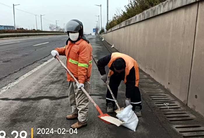 該分公司黨員突擊隊(duì)兵分3路,分別來(lái)到徐圩大道、港前大道、海濱大道核心路段。生產(chǎn)骨干沈萬(wàn)軍、李傳武、張樹華等同志他們相互配合,手拿鐵锨簡(jiǎn)單有效的進(jìn)行撒放融雪劑60余噸。發(fā)現(xiàn)道路低洼結(jié)冰處及車輛轉(zhuǎn)彎口,他們立即下車?yán)醚╃P,有來(lái)有回的將冰凍鏟除,消除路面一切安全隱患。