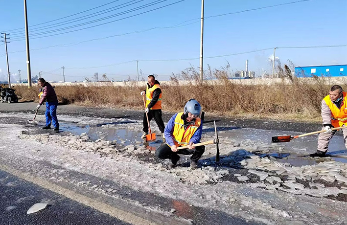 近期由于受冷空氣影響,氣溫低下,園區(qū)道路低洼積水處產(chǎn)生大面積結(jié)冰現(xiàn)象,如不及時清除,嚴(yán)重造成車輛側(cè)翻事故發(fā)生。道路排查現(xiàn)場,管理人員及時與園區(qū)二班對接,聯(lián)合開展“破冰保暢通”突擊活動。大家各負(fù)其責(zé),齊心協(xié)力,揮動手中鐵銑、羊鎬,經(jīng)過近4個多小時共同奮戰(zhàn),撬動冰塊近400多塊,清理積水300多平方、20多處。